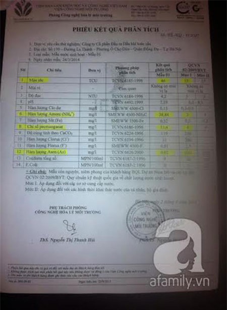 Cụ thể là hàm lượng Asen (thạch tín) cao gấp 2 lần cho phép của Bộ y tế. Ông Vũ Thanh Sơn chia sẻ: “Theo kết quả kiểm định, khu dân cư chúng tôi hết sức bàng hoàng khi biết nguồn nước từ tòa nhà cung cấp bị nhiễm asen, những hộ gia đình có con nhỏ như hộ gia đình tôi phải mua bình nước lọc về sử dụng cho sinh hoạt ăn uống hằng ngày. Biết nguồn nước gây nguy hiểm tới đến sức khỏe, nhưng điều kiện kinh tế không cho phép, buộc người dân chúng tôi vẫn phải sử dụng".