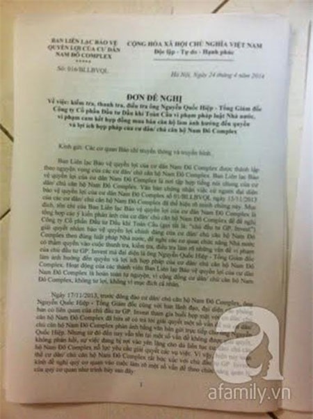 Đơn đề nghị của các hộ dân tại khu chung cư Nam Đô